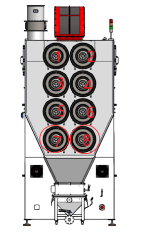 如圖1所示,7、8號濾筒由于更靠近壁面,與壁面之間的空間突然變狹小,氣流經過此處時速度會增加,左側紅框內速度大概在25m/s以上,右側大約15m/s。