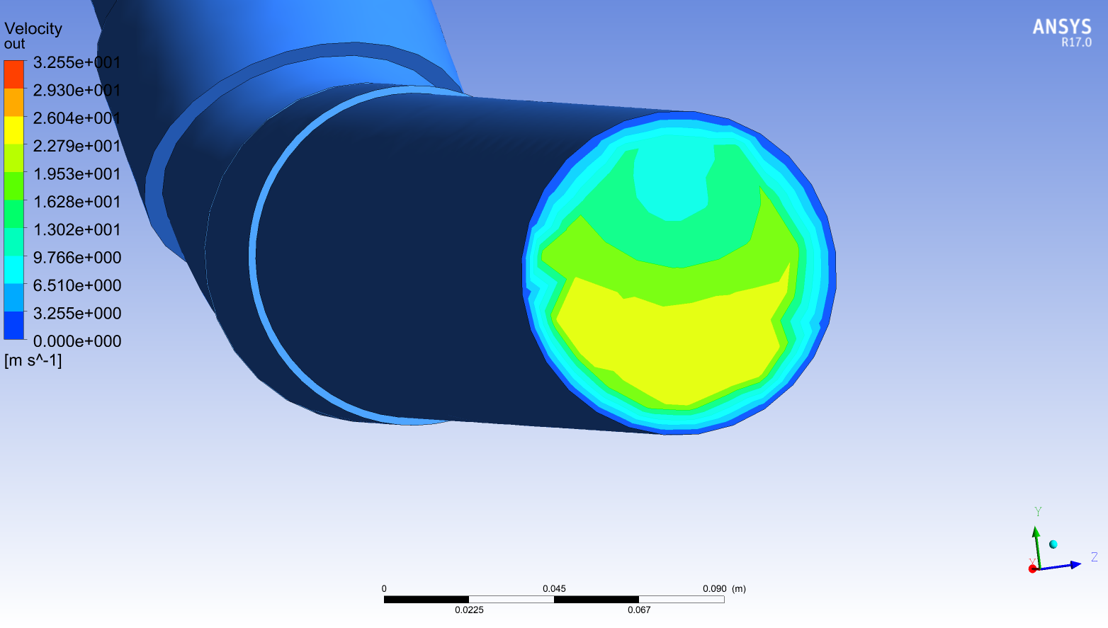 實際工作情況中,主要是1號和3號濾筒受損嚴重。由于整個系統為對稱結構,因此兩個濾筒表面情況類似,這里僅針對1號濾筒進行分析。濾筒表面風速云圖如圖2.3所示,1號濾筒三個方框的位置表面風速較高,最高接近20m/s,接近入口風速,因此這三個地方的受損比較嚴重,實際情況也確實如此。因此需要降低濾筒表面風速,即間接降低小粒徑顆粒對濾筒的沖刷速度。濾筒的表面最大風速如下表所示。