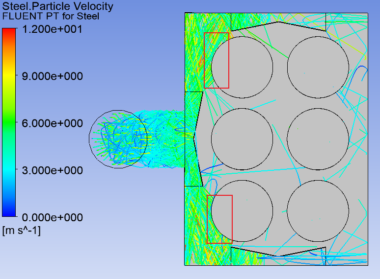 圖3-1、3-2為顆粒軌跡圖,顆粒材料為銅,質量流率較低、粒徑小、密度大,所以考慮重力和空氣曳力。由圖可知,5、7、8號三個濾筒均受到顆粒的直接沖擊。 綜上,5、7、8號濾筒均沖刷較為嚴重,其中7、8號最嚴重,主要原因為通過這兩個濾筒側面的風速過大,顆粒能量大,對濾筒撞擊能量大。