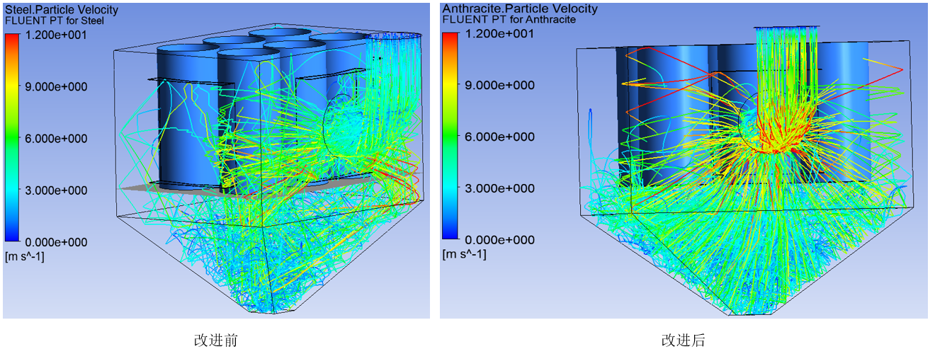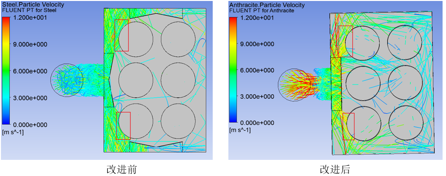 3、改善大粒徑對濾筒的沖刷。改進后雖然仍有速度較高的大粒徑對濾筒的沖擊,但是相比于改進前,沖擊濾筒的顆粒速度減少。另外,從顆粒分布圖中可知,新的擾流板有利于大粒徑的自然沉降,降低了濾筒的工作強度。