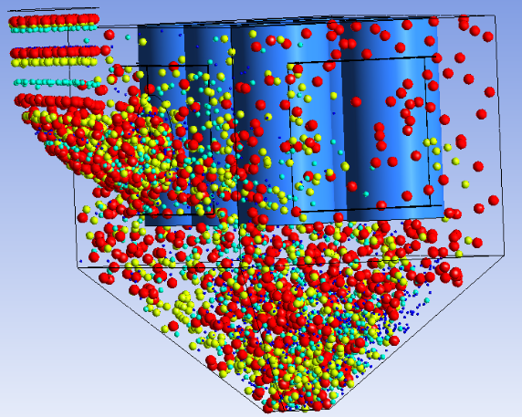 針對>100um粒徑的顆粒,對其進行顆粒軌跡分析,由圖2.4可知,大顆粒1號和3號濾筒附近的表面顆粒速度在6~9m/s,對濾筒沖擊較大,線條密集代表此處的顆粒較多,從圖2.5顆粒分布圖模擬圖也佐證了這一點。